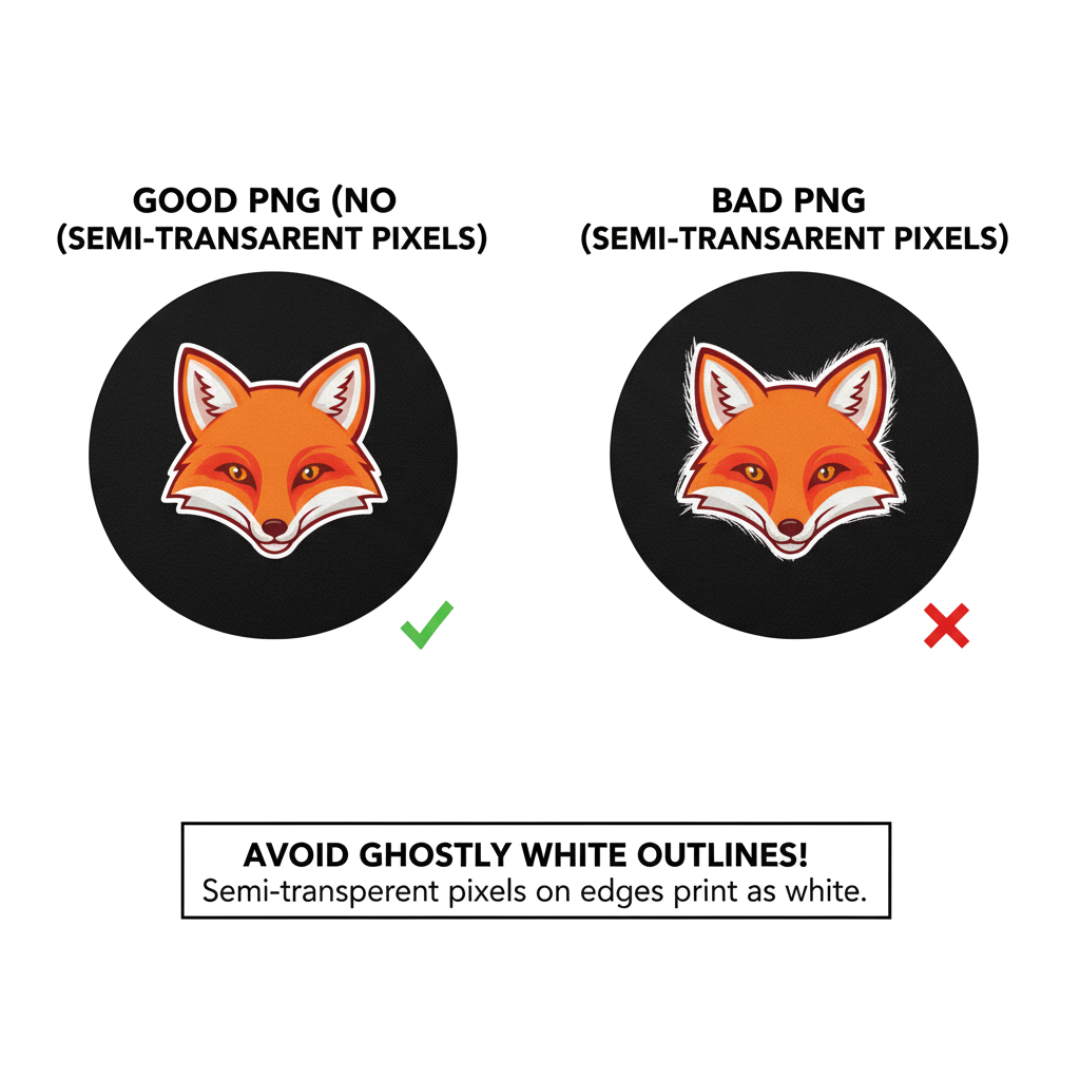 If your PNG file has semi-transparent pixels (like feathered or faded edges), our printer might interpret them as white ink. To prevent a thin, ghostly white outline around your finished design, make sure your edges are fully opaque or completely transparent.
