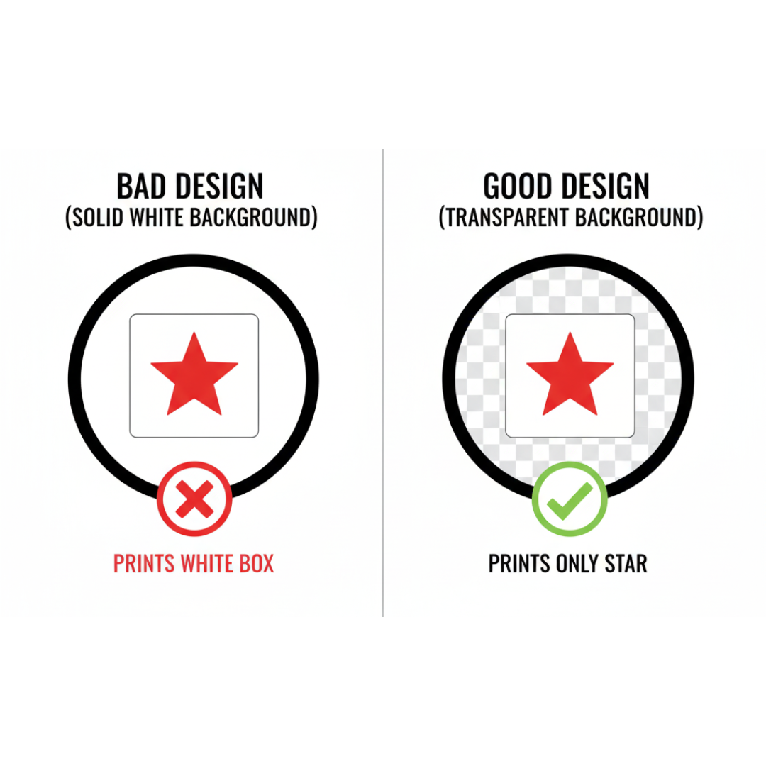 Please make absolutely sure your design files have a transparent background. Our DTF printer will print everything it sees in the image—including any solid white background—so if you send a white box, you'll get a white box!